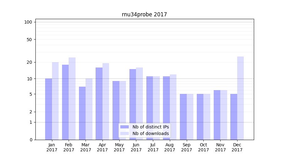 Number of downloads for annotation package rnu34probe, year by year, from 2025 back to 2014 (years with no downloads are omitted):