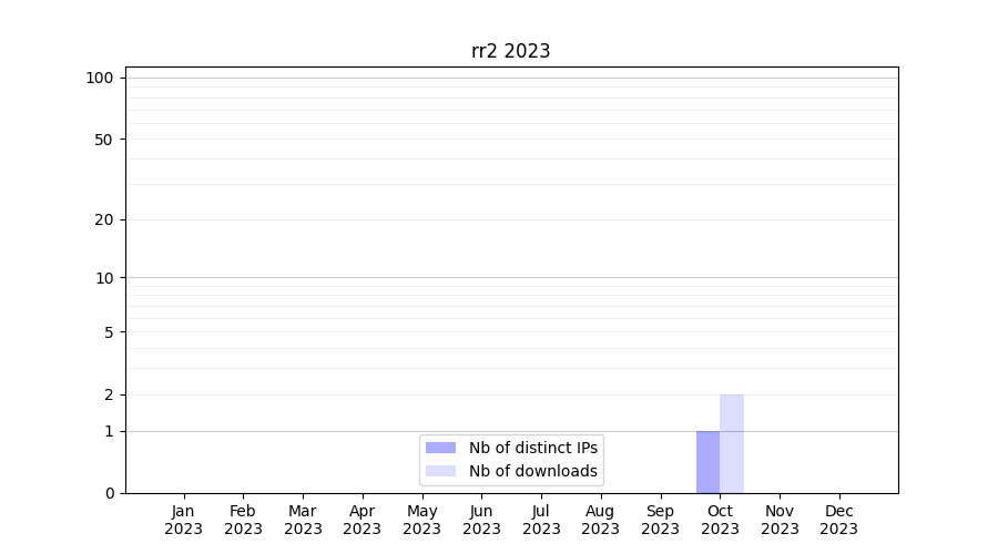 Number of downloads for annotation package rr2, year by year, from 2025 back to 2014 (years with no downloads are omitted):