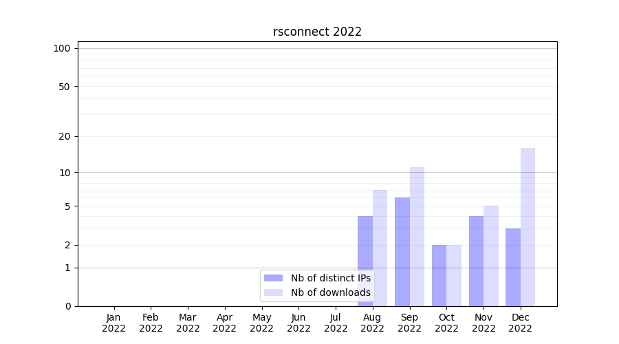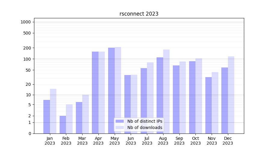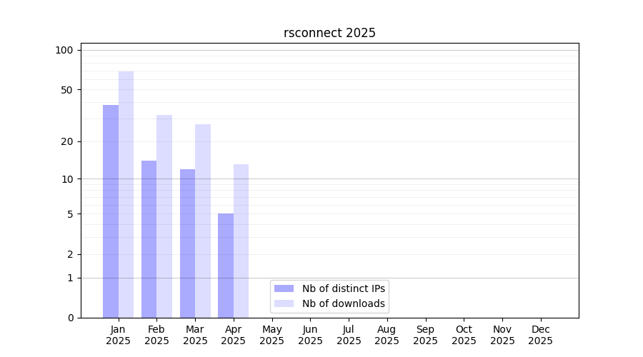Number of downloads for annotation package rsconnect, year by year, from 2025 back to 2014 (years with no downloads are omitted):