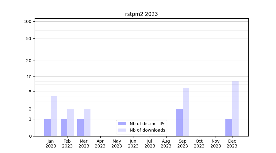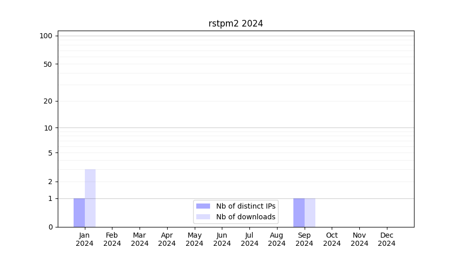 Number of downloads for annotation package rstpm2, year by year, from 2025 back to 2014 (years with no downloads are omitted):