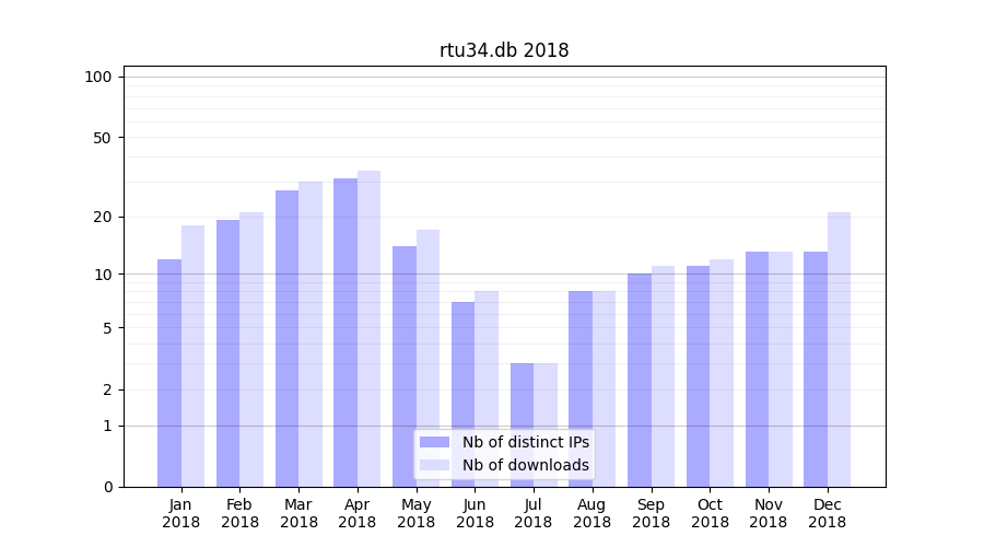Number of downloads for annotation package rtu34.db, year by year, from 2025 back to 2014 (years with no downloads are omitted):