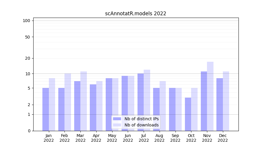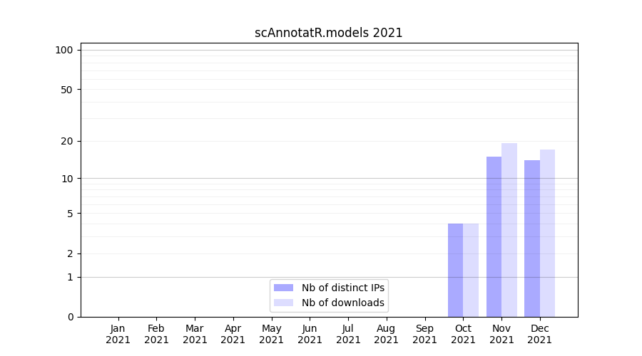 Number of downloads for annotation package scAnnotatR.models, year by year, from 2025 back to 2014 (years with no downloads are omitted):