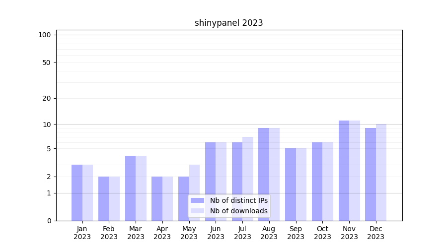 Number of downloads for annotation package shinypanel, year by year, from 2025 back to 2014 (years with no downloads are omitted):