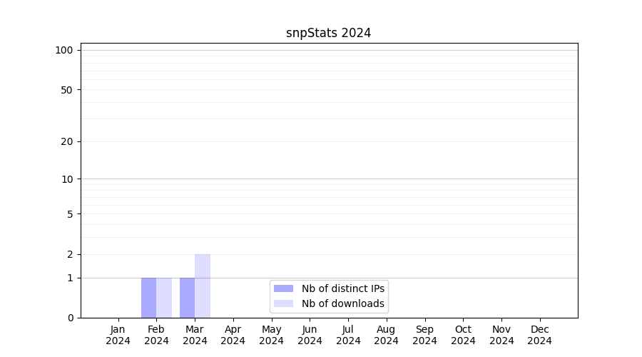 Number of downloads for annotation package snpStats, year by year, from 2025 back to 2014 (years with no downloads are omitted):