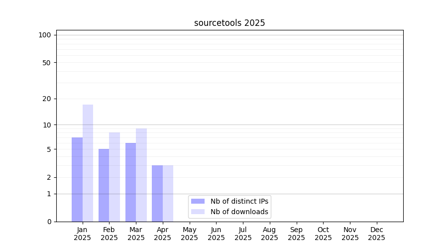 Number of downloads for annotation package sourcetools, year by year, from 2025 back to 2014 (years with no downloads are omitted):