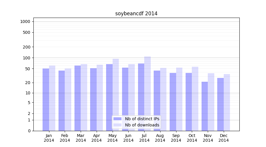 Number of downloads for annotation package soybeancdf, year by year, from 2025 back to 2014 (years with no downloads are omitted):