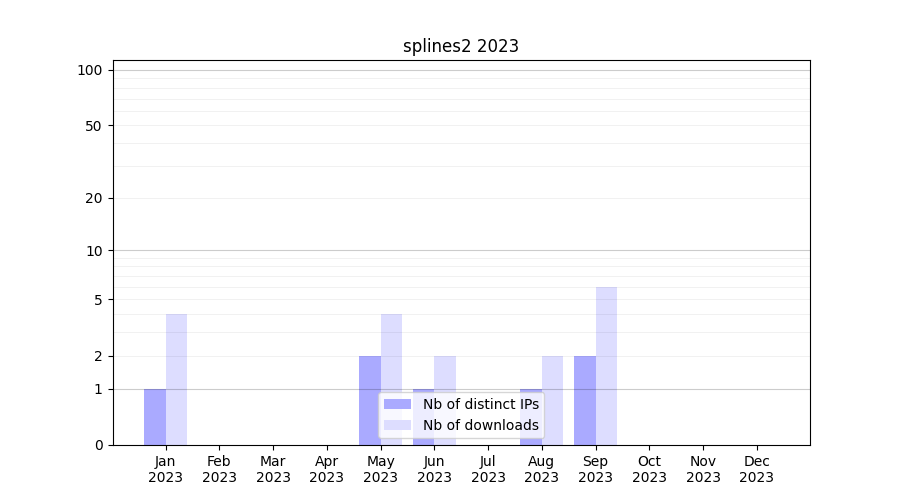 Number of downloads for annotation package splines2, year by year, from 2025 back to 2014 (years with no downloads are omitted):