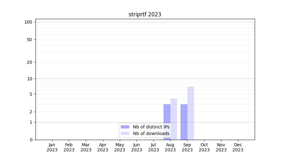 Number of downloads for annotation package striprtf, year by year, from 2025 back to 2014 (years with no downloads are omitted):