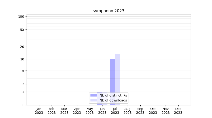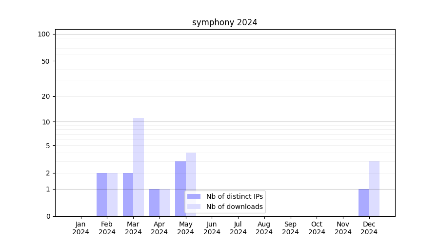 Number of downloads for annotation package symphony, year by year, from 2025 back to 2014 (years with no downloads are omitted):