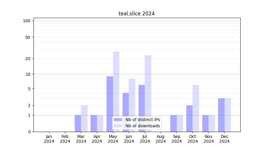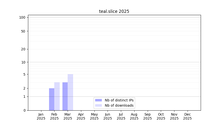 Number of downloads for annotation package teal.slice, year by year, from 2025 back to 2014 (years with no downloads are omitted):