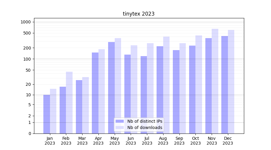 Number of downloads for annotation package tinytex, year by year, from 2025 back to 2014 (years with no downloads are omitted):