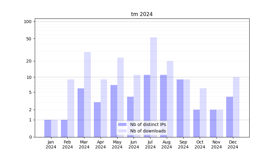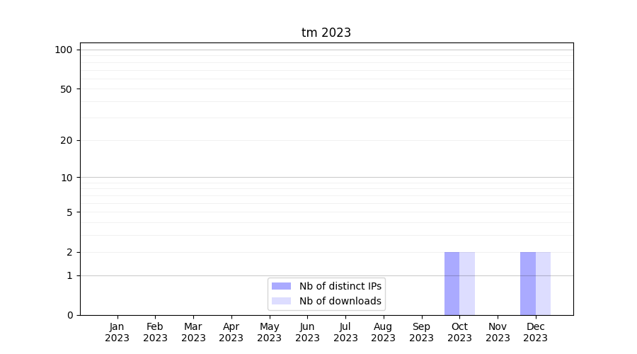 Number of downloads for annotation package tm, year by year, from 2025 back to 2014 (years with no downloads are omitted):