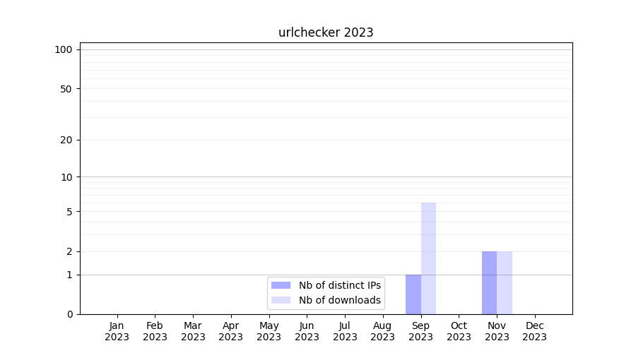 Number of downloads for annotation package urlchecker, year by year, from 2025 back to 2014 (years with no downloads are omitted):