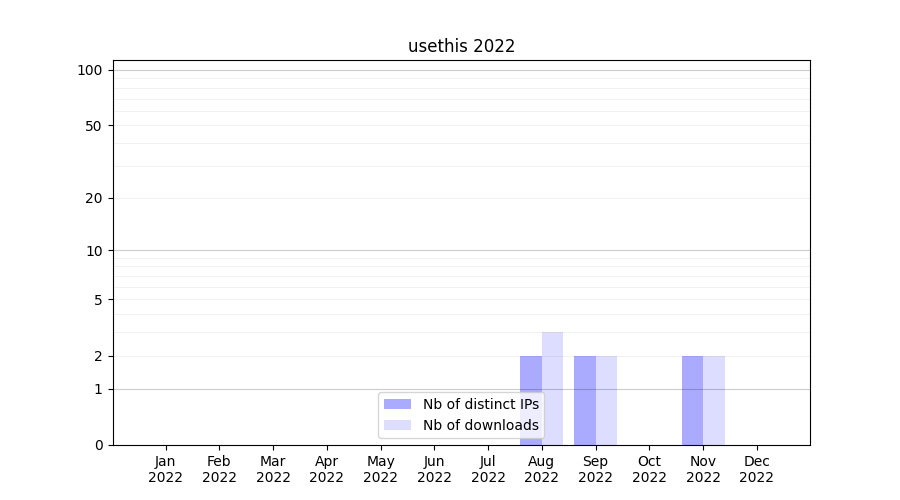 Number of downloads for annotation package usethis, year by year, from 2025 back to 2014 (years with no downloads are omitted):