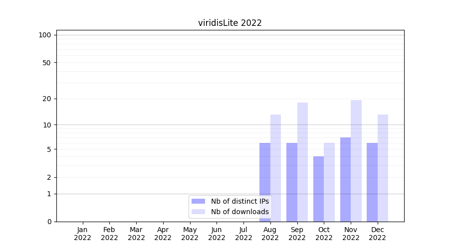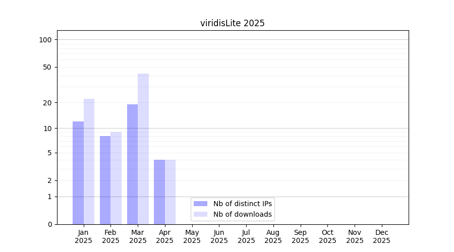 Number of downloads for annotation package viridisLite, year by year, from 2025 back to 2014 (years with no downloads are omitted):