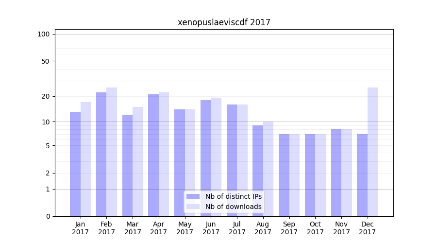 Number of downloads for annotation package xenopuslaeviscdf, year by year, from 2025 back to 2014 (years with no downloads are omitted):