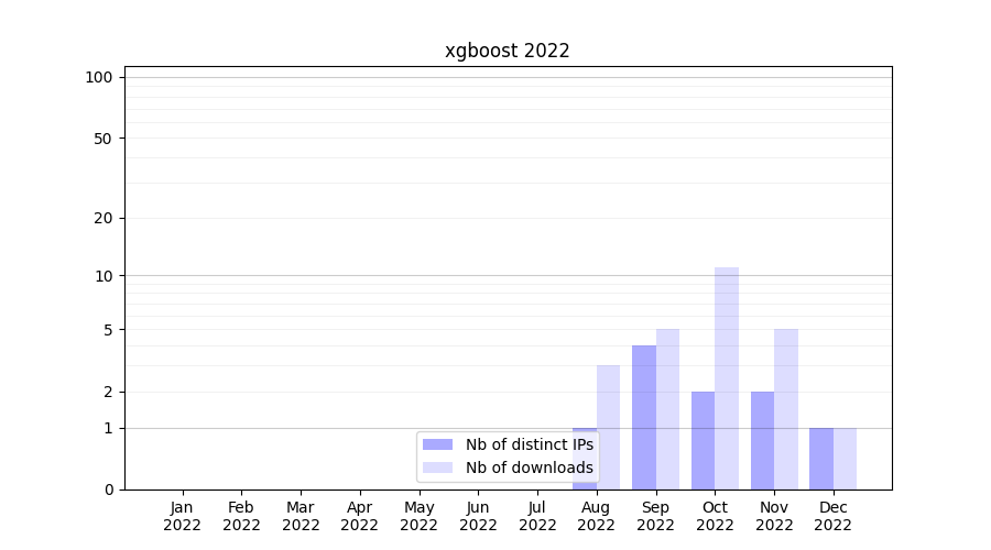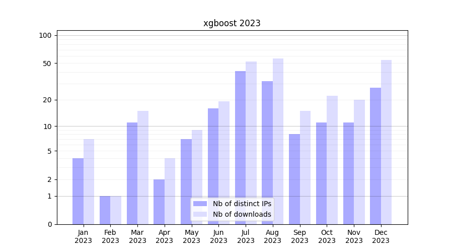Number of downloads for annotation package xgboost, year by year, from 2025 back to 2014 (years with no downloads are omitted):