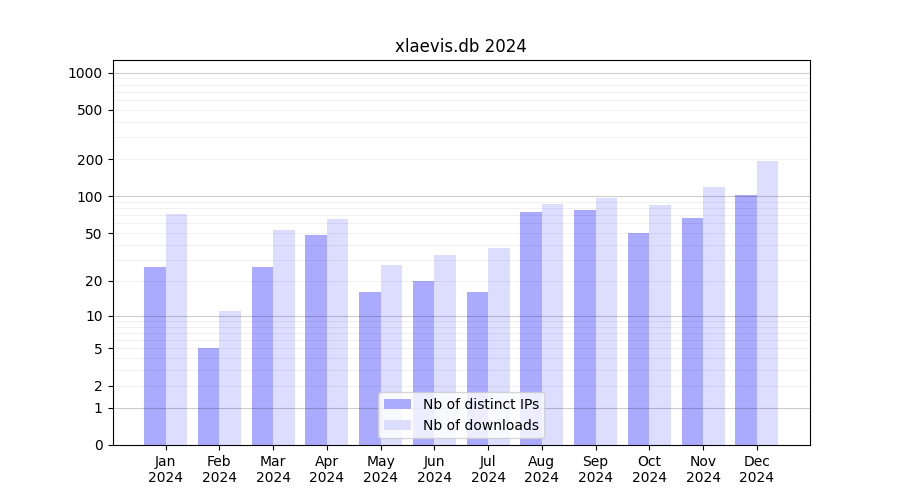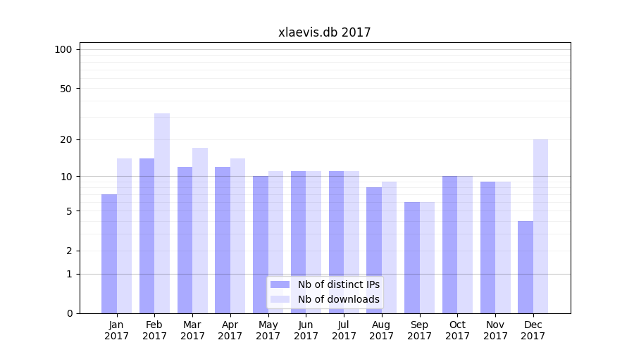 Number of downloads for annotation package xlaevis.db, year by year, from 2025 back to 2014 (years with no downloads are omitted):