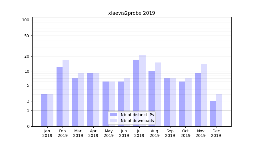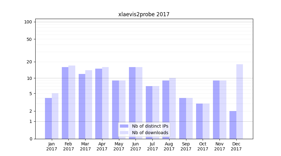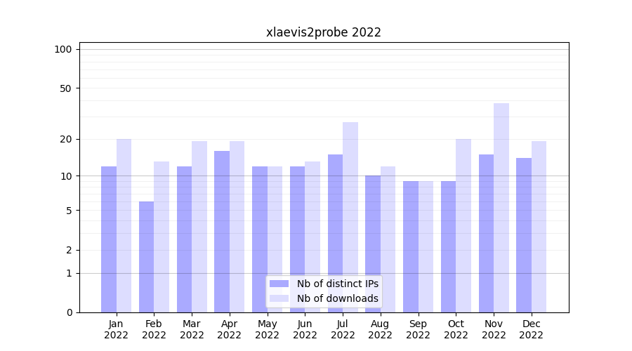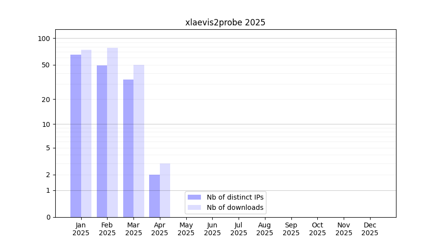 Number of downloads for annotation package xlaevis2probe, year by year, from 2025 back to 2014 (years with no downloads are omitted):