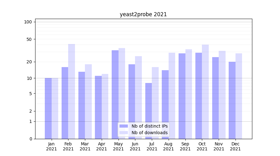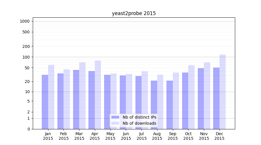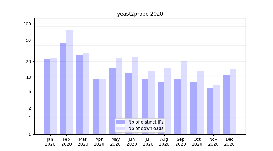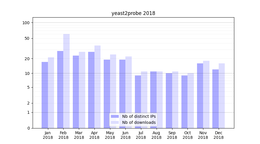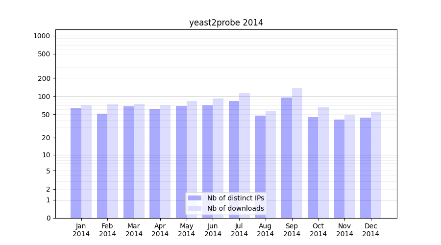 Number of downloads for annotation package yeast2probe, year by year, from 2025 back to 2014 (years with no downloads are omitted):