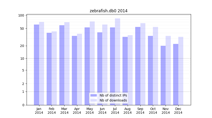 Number of downloads for annotation package zebrafish.db0, year by year, from 2025 back to 2014 (years with no downloads are omitted):