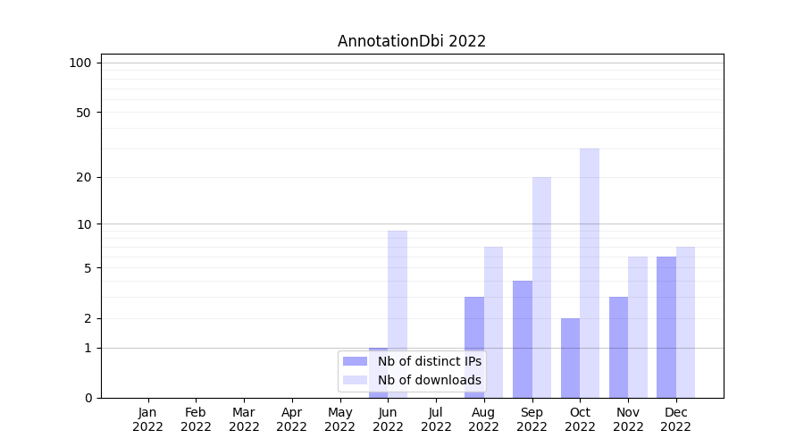 Number of downloads for experiment package AnnotationDbi, year by year, from 2025 back to 2014 (years with no downloads are omitted):