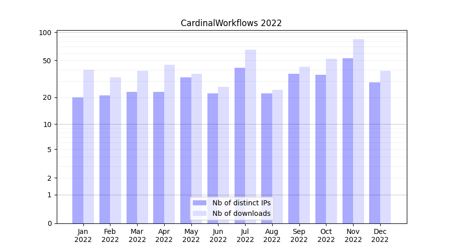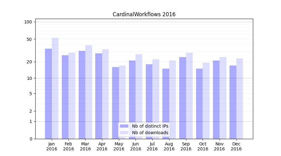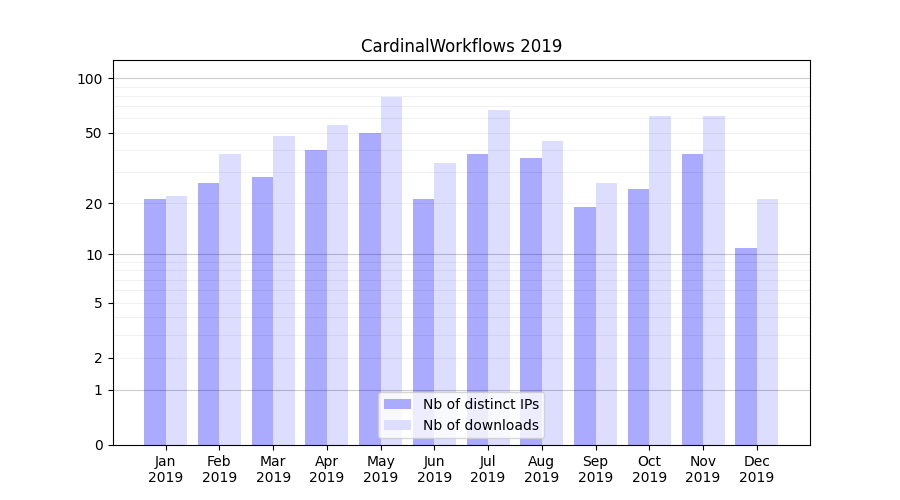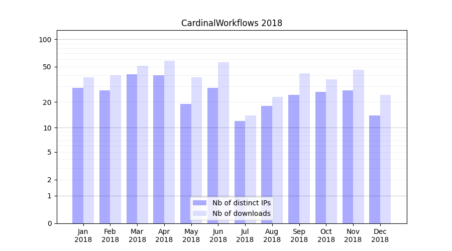 Number of downloads for experiment package CardinalWorkflows, year by year, from 2025 back to 2014 (years with no downloads are omitted):