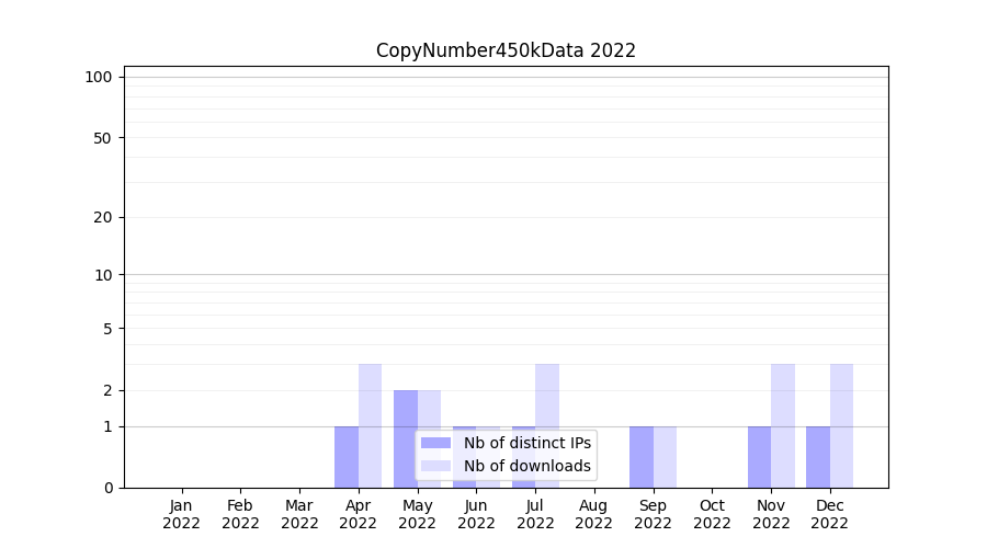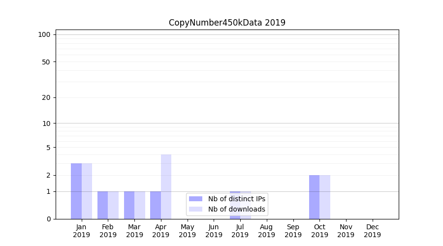 Number of downloads for experiment package CopyNumber450kData, year by year, from 2025 back to 2014 (years with no downloads are omitted):