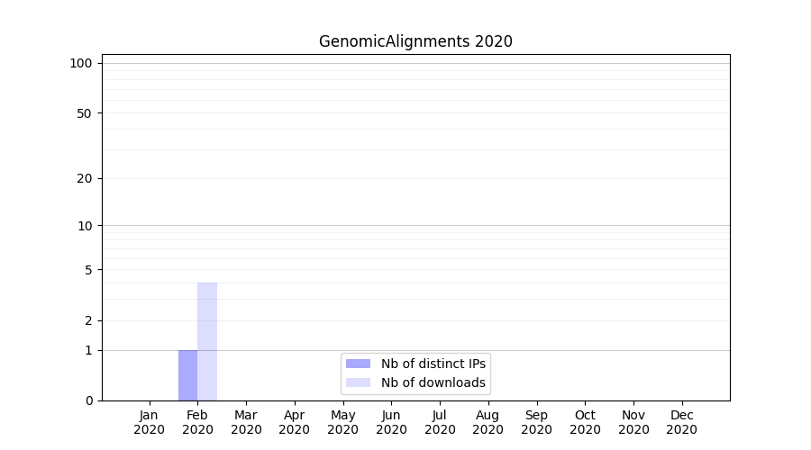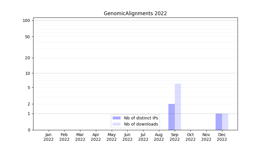 Number of downloads for experiment package GenomicAlignments, year by year, from 2025 back to 2014 (years with no downloads are omitted):