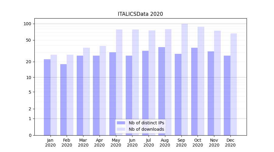Number of downloads for experiment package ITALICSData, year by year, from 2025 back to 2014 (years with no downloads are omitted):
