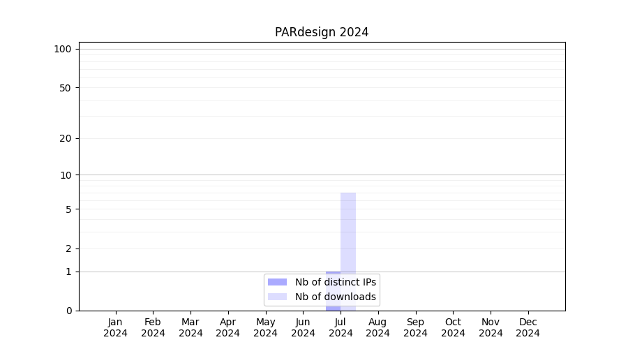Number of downloads for experiment package PARdesign, year by year, from 2025 back to 2014 (years with no downloads are omitted):