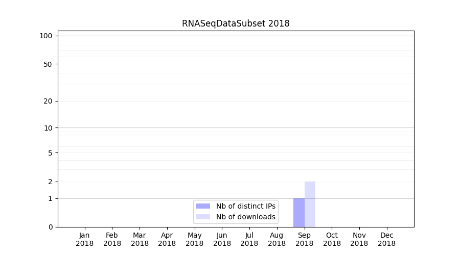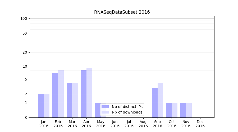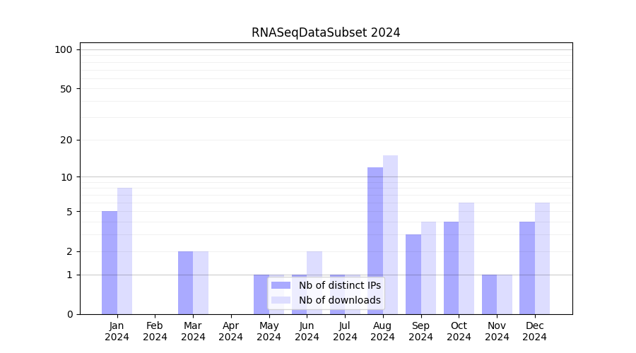 Number of downloads for experiment package RNASeqDataSubset, year by year, from 2025 back to 2014 (years with no downloads are omitted):