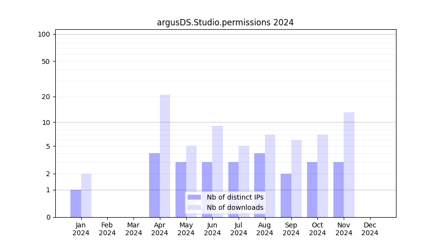 Number of downloads for experiment package argusDS.Studio.permissions, year by year, from 2025 back to 2014 (years with no downloads are omitted):
