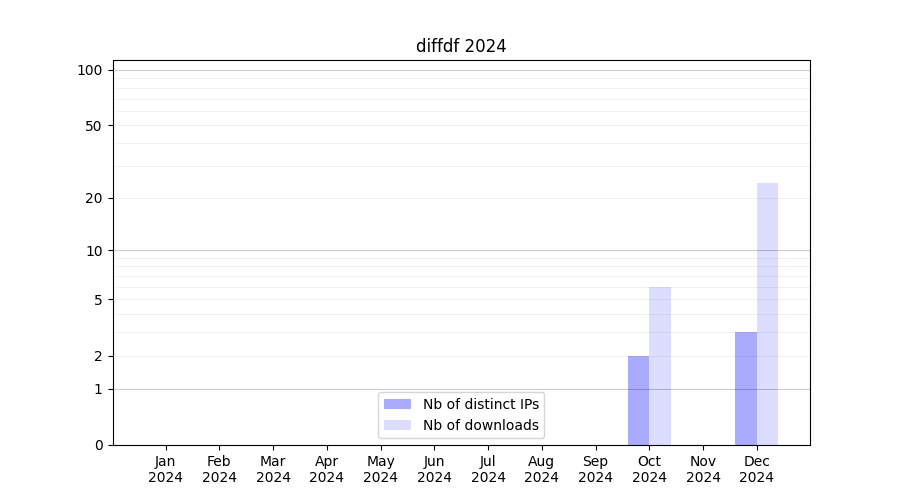 Number of downloads for experiment package diffdf, year by year, from 2025 back to 2014 (years with no downloads are omitted):