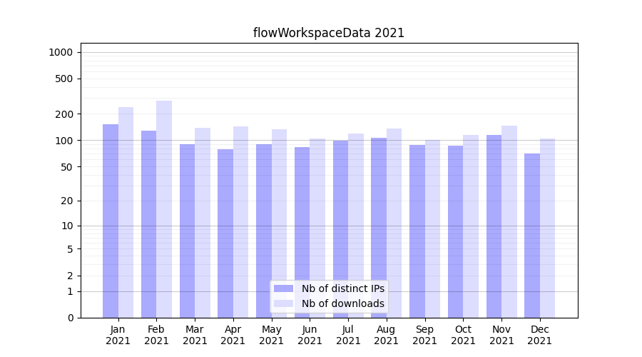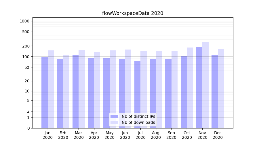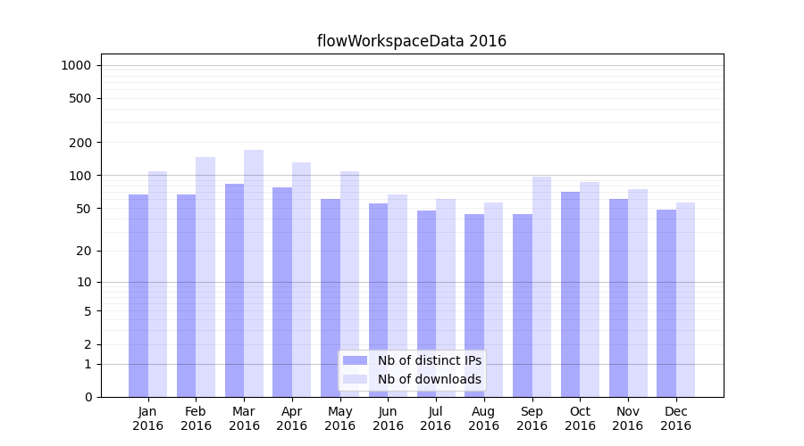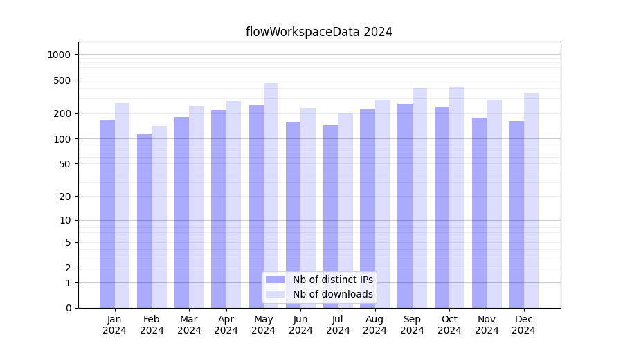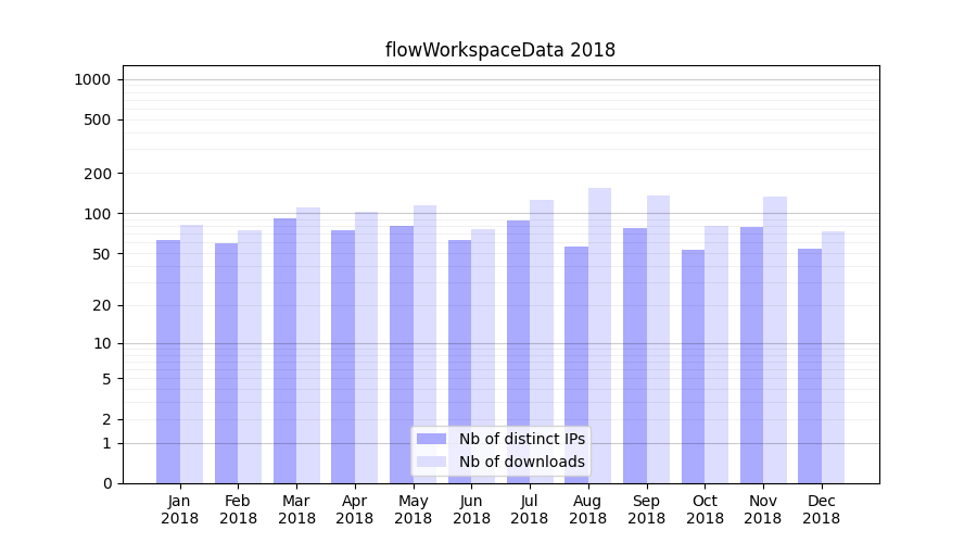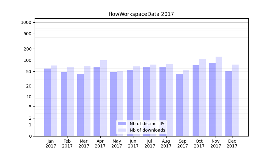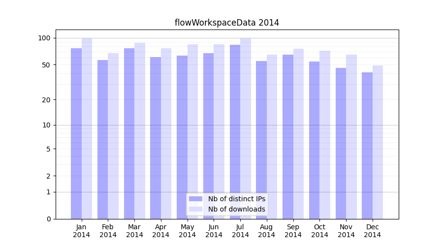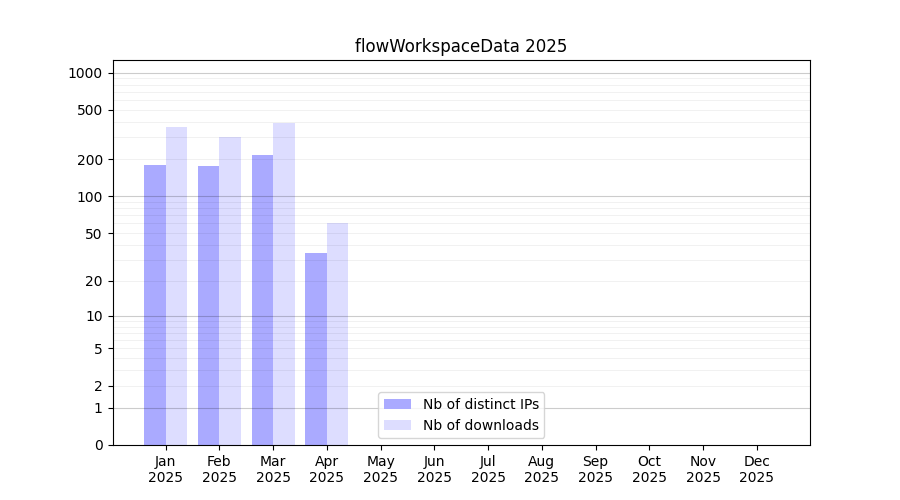 Number of downloads for experiment package flowWorkspaceData, year by year, from 2025 back to 2014 (years with no downloads are omitted):