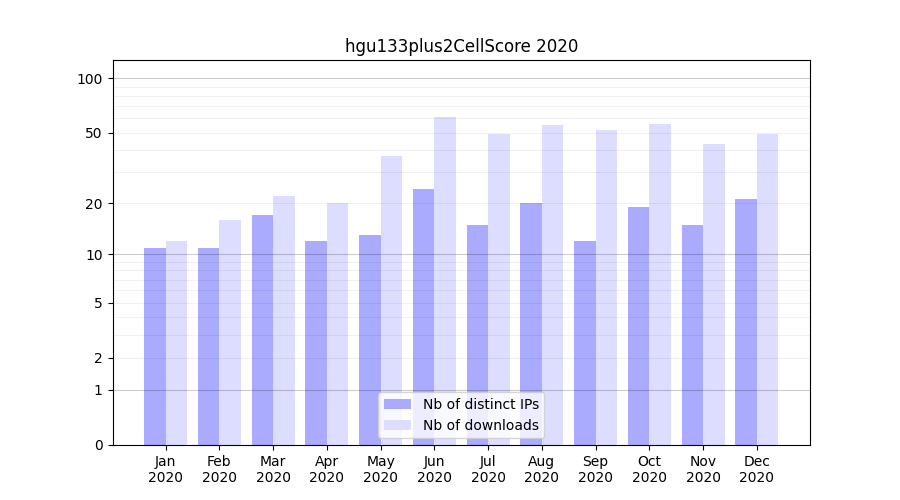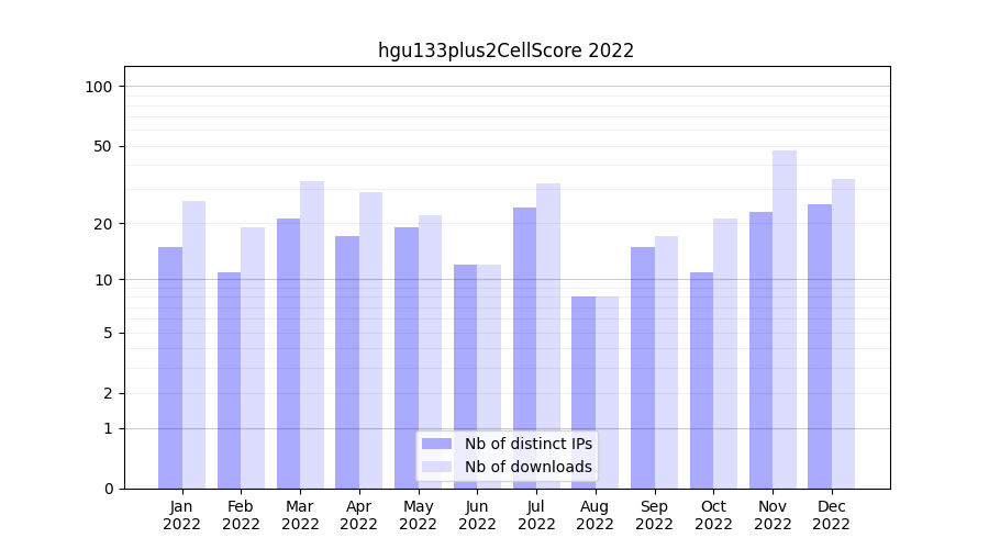 Number of downloads for experiment package hgu133plus2CellScore, year by year, from 2025 back to 2014 (years with no downloads are omitted):