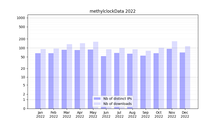 Number of downloads for experiment package methylclockData, year by year, from 2025 back to 2014 (years with no downloads are omitted):