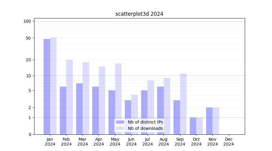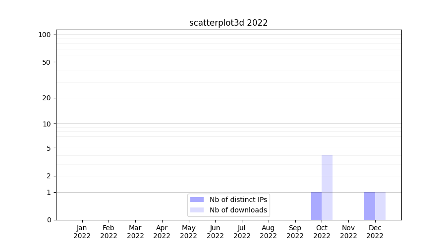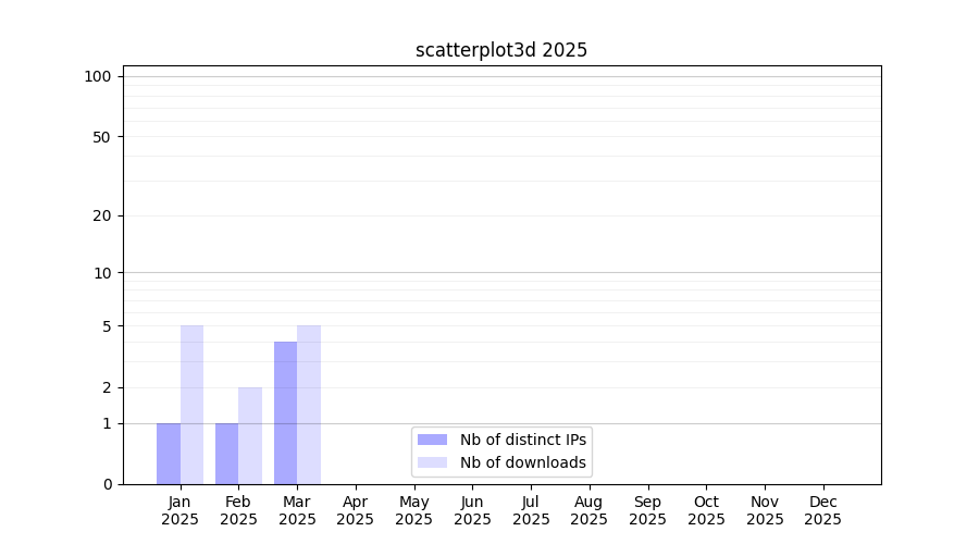 Number of downloads for experiment package scatterplot3d, year by year, from 2025 back to 2014 (years with no downloads are omitted):