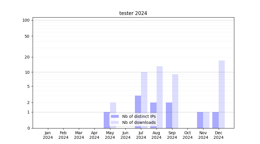 Number of downloads for experiment package tester, year by year, from 2025 back to 2014 (years with no downloads are omitted):