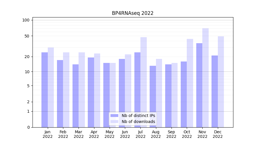 Number of downloads for workflow package BP4RNAseq, year by year, from 2025 back to 2015 (years with no downloads are omitted):