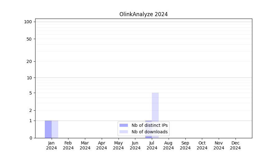 Number of downloads for workflow package OlinkAnalyze, year by year, from 2025 back to 2015 (years with no downloads are omitted):