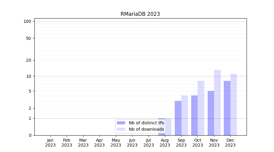Number of downloads for workflow package RMariaDB, year by year, from 2025 back to 2015 (years with no downloads are omitted):