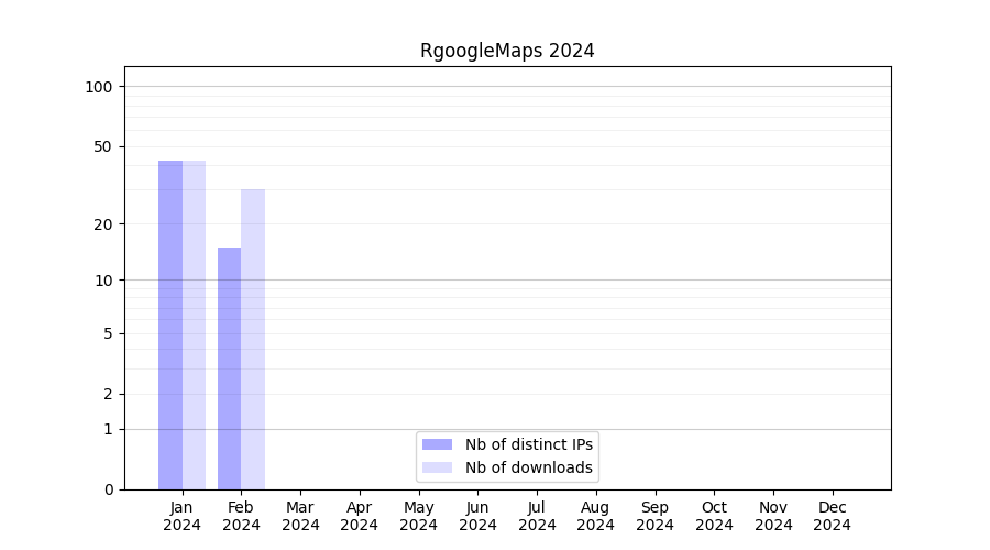Number of downloads for workflow package RgoogleMaps, year by year, from 2025 back to 2015 (years with no downloads are omitted):