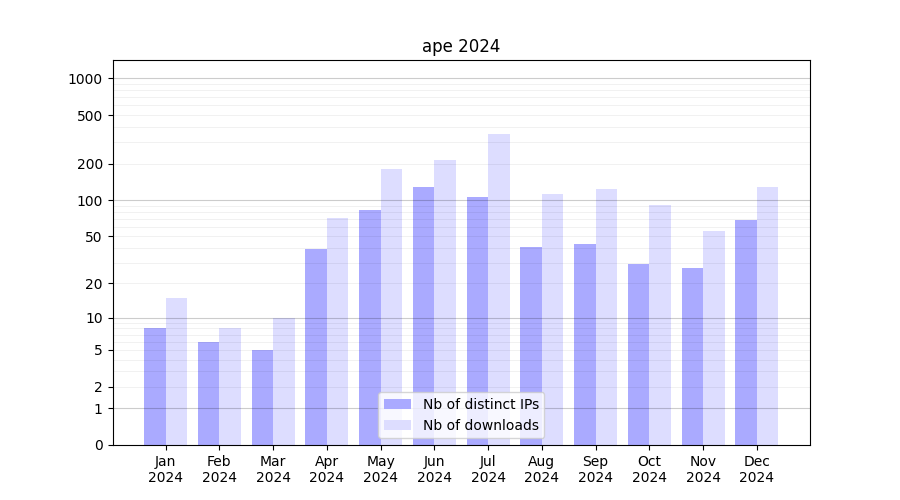 Number of downloads for workflow package ape, year by year, from 2025 back to 2015 (years with no downloads are omitted):