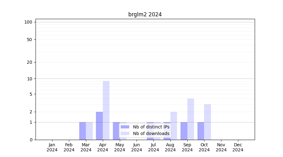 Number of downloads for workflow package brglm2, year by year, from 2025 back to 2015 (years with no downloads are omitted):
