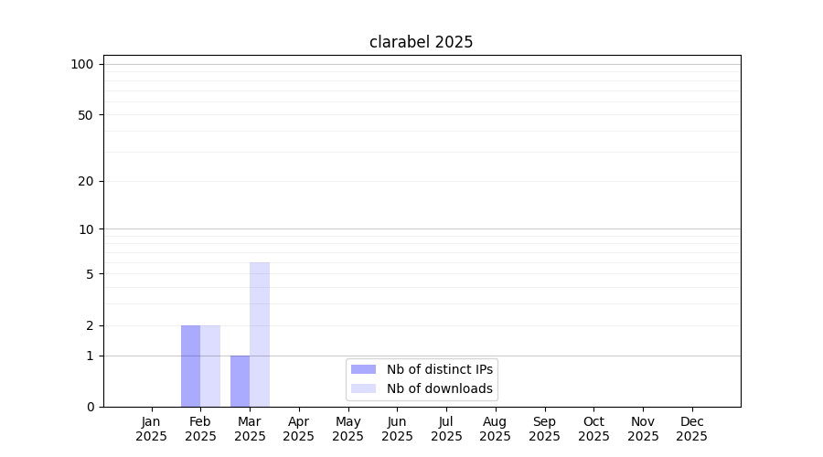 Number of downloads for workflow package clarabel, year by year, from 2025 back to 2015 (years with no downloads are omitted):