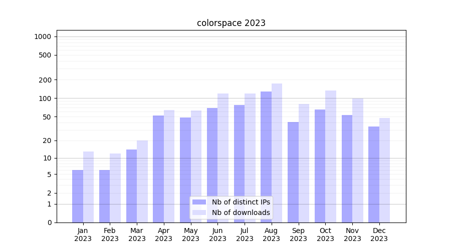 Number of downloads for workflow package colorspace, year by year, from 2025 back to 2015 (years with no downloads are omitted):