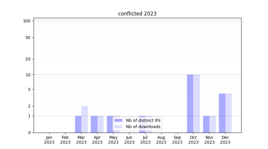 Number of downloads for workflow package conflicted, year by year, from 2025 back to 2015 (years with no downloads are omitted):