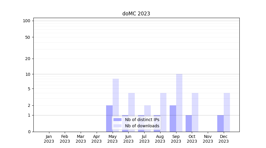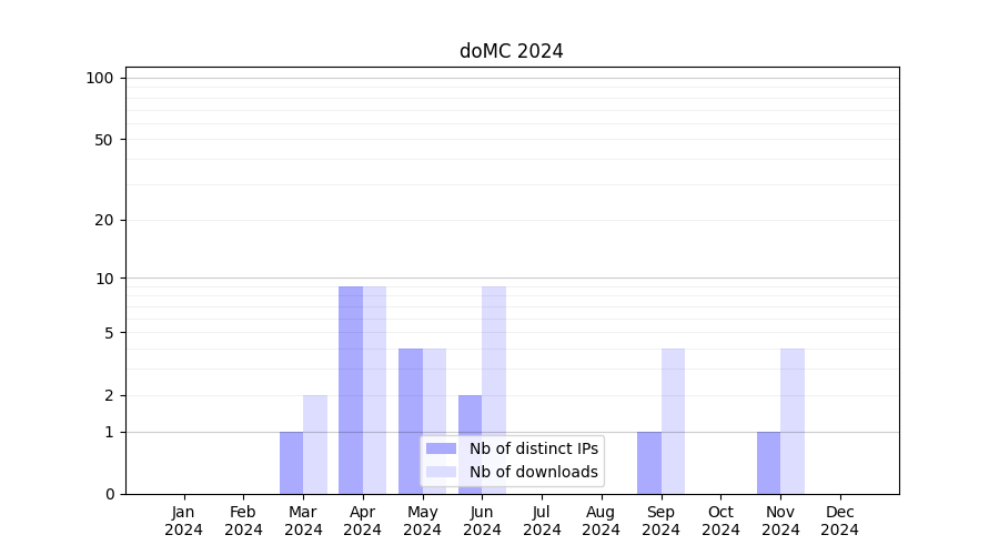 Number of downloads for workflow package doMC, year by year, from 2025 back to 2015 (years with no downloads are omitted):