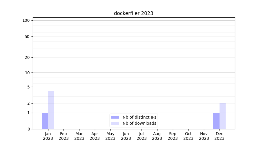 Number of downloads for workflow package dockerfiler, year by year, from 2025 back to 2015 (years with no downloads are omitted):